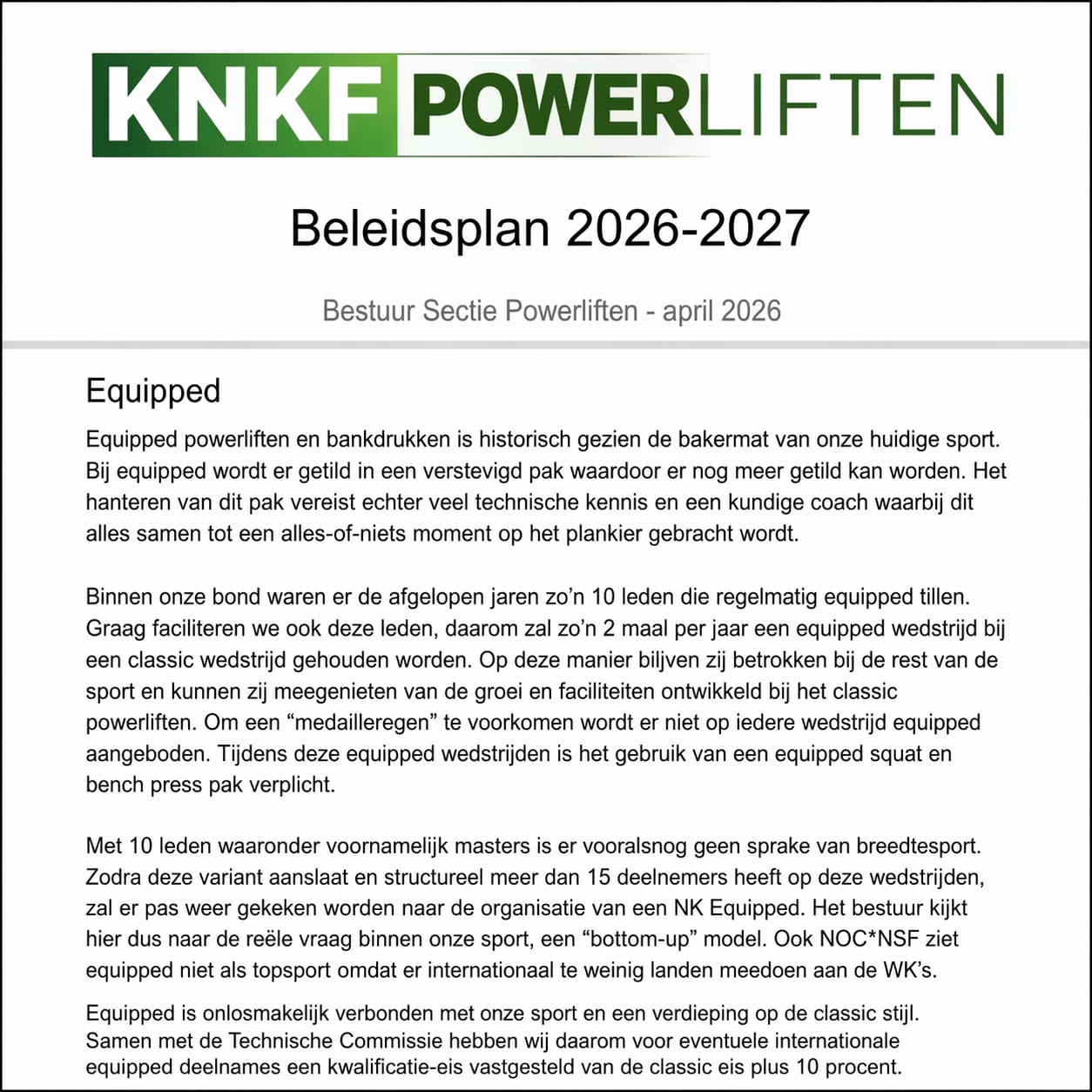 Hier het stuk over het Equipped Powerliften in het beleidsplan KNKF sectie powerliften 2026/2027 Jammer dat er maar 3 equipped lifters meedoen aan de Breda Cup equipped. Hiervan mag ik er 2 trainen. De wedstrijd is ook gepland gelijk met het EK Masters Equipped Powerliften. Het was de bedoeling deel te nemen aan het EK en als je als sectie dan precies een equipped wedstrijd gaat plannen, dan ben je ‘echt’ verbonden aan die tak van sport. Als je dan vraagt of jij ‘normale’ coach meekan als assistent, krijg je het antwoord: we hebben een bondscoach equipped en dat is dus onnodig. Blijkbaar is degene die geantwoord heeft onvoldoende op de hoogte van de benodigde skills, zie beleidsplan. Iemand laten certificeren als IPF coach betekent natuurlijk dat je gelijk een goede internationale coach bent. Of is het gewoon een verdienmodel van de @theipf